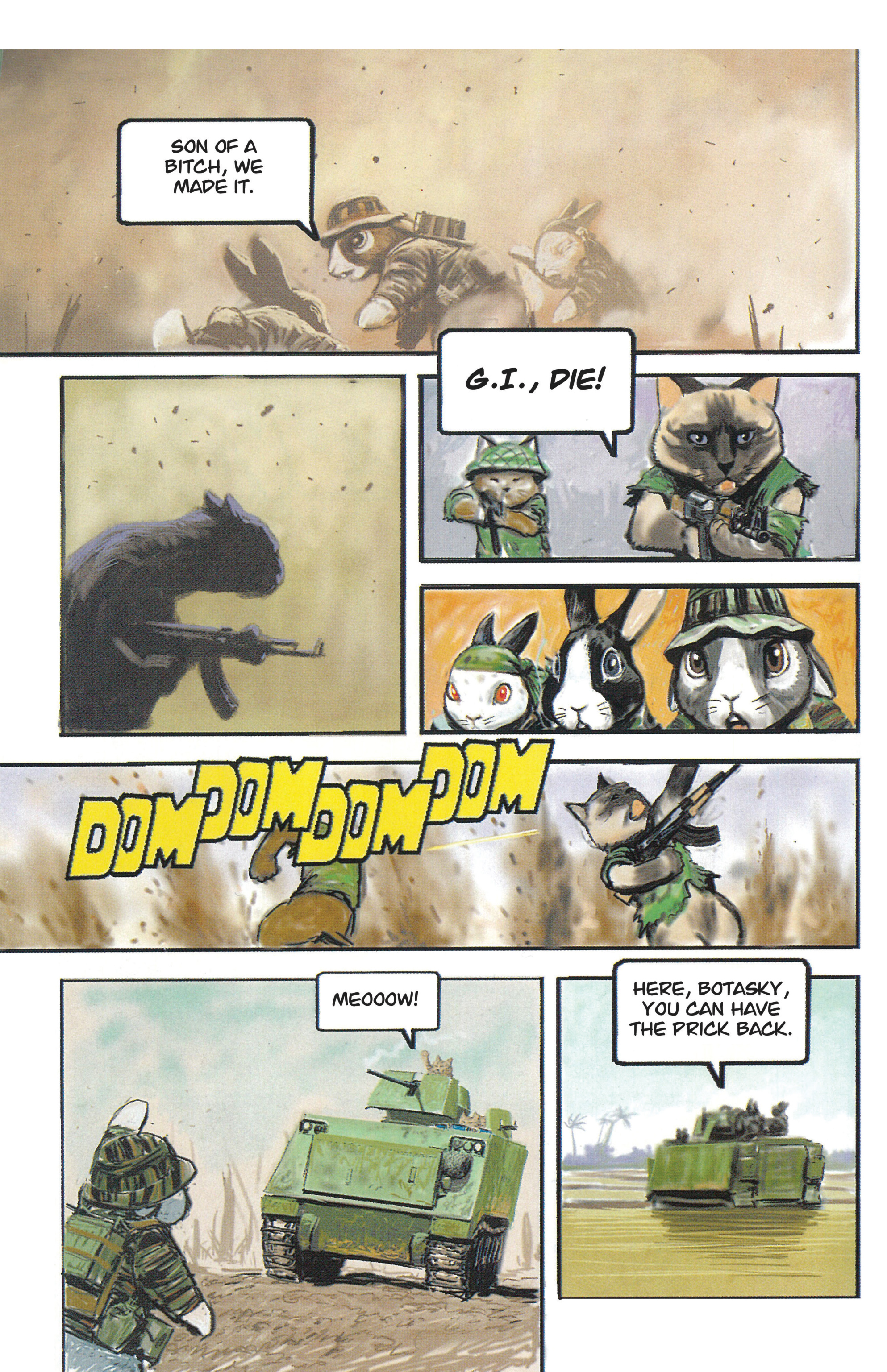 OK ok. Vím, co vám milí čtenáři leží na srdci. Zarazila vás podoba protagonistů. Na to je úplně jednoduchá odpověď. Autor Motofumi Kobayashi chtěl vytvořit historickou mangu odehrávající se během války ve Vietnamu. Na doporučení svého redaktora pak ale upravil podobu postav a všechny lidi nahradil zvířaty. Vietnamci jsou siamské kočky a Američani jsou králíčci. Pro králíčky se autor rozhodnul kvůli slovní hříčce. Spojené státy mají zkratku USA a pro americké vojáky se používá zkratka GI. Spojte si to dohromady a dostanete USAGI, neboli králíka. Krom koček a králíčků se můžete těšit i na ruské medvědy a japonské opice. Zmínění Japonci jsou zajímavou historickou tečkou. Jednotky japonské domobrany byly potají nasazeny ve Vietnamu, což porušuje smlouvy o odzbrojování z konce druhé světové války. Dalším často ignorovaným historickým detailem je spolupráce místních domorodých kmenů a amerických jednotek. Ostatně pokud vás podrobněji zajímají události okolo této války, tak s nadšením uvítáme podrobné historické komentáře plné map a dalších informací, které vám pomohou lépe pochopit detaily.