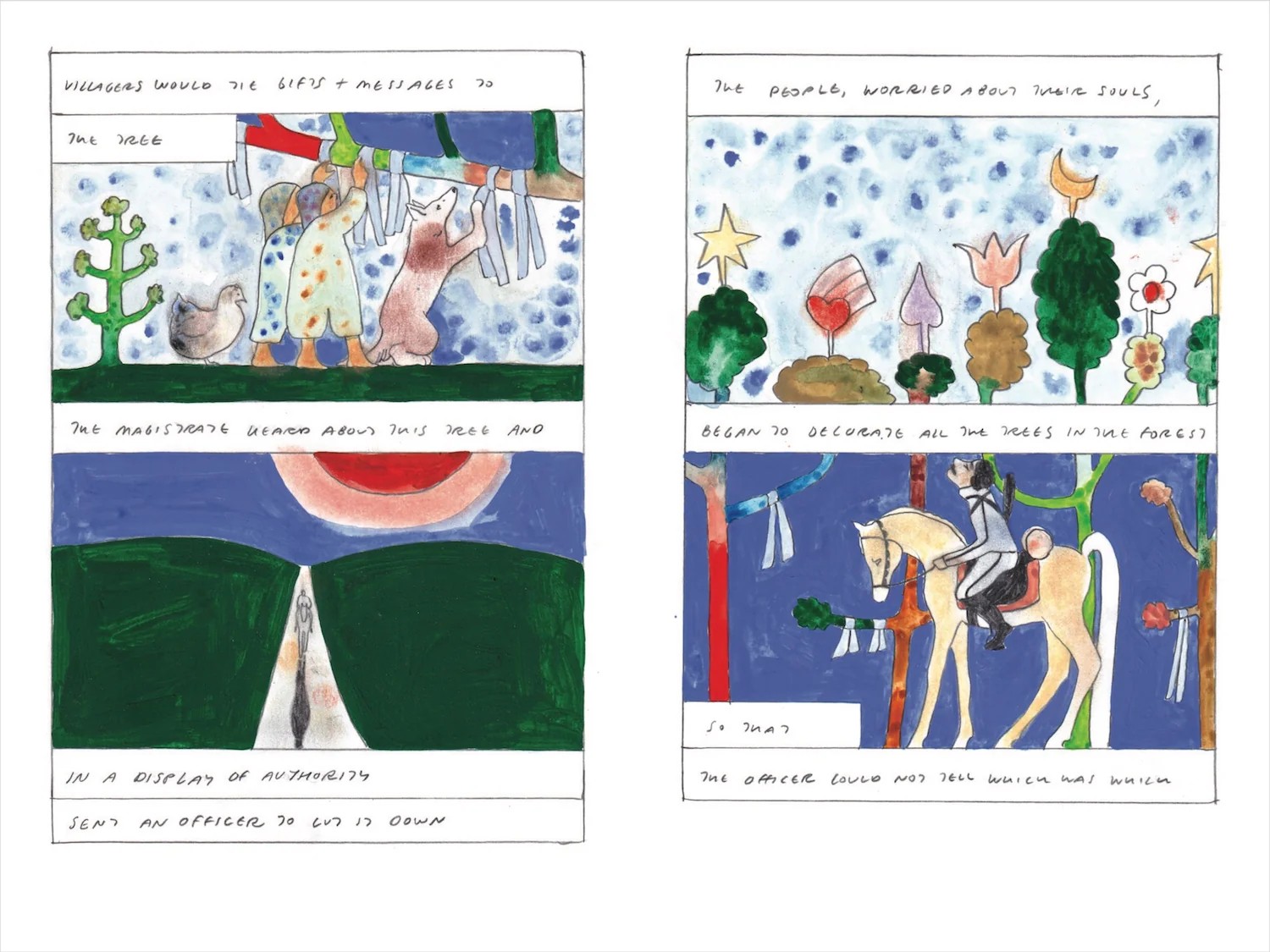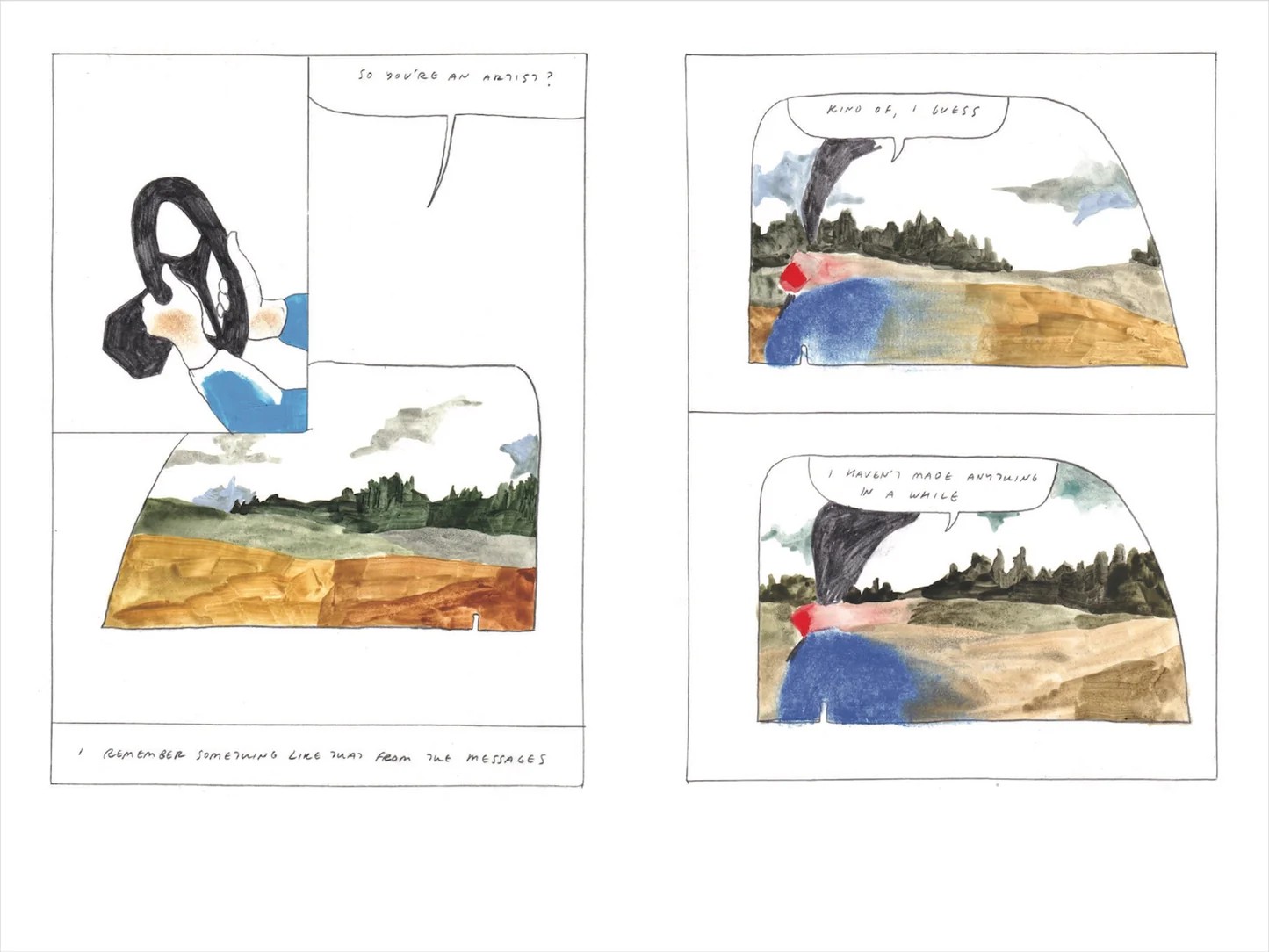 Americká umělkyně žijící vprostřed kalifornské pouště vytvořila čtyři kreslené příběhy, které nezkoumají pouze lidské touhy a směřování, stejně jako náš ekosystém, ve kterém žijeme, ale také hranice komiksového média. Její příběhy nejsou jednoduše uchopitelné a nechávají prostor pro čtenářovu interpretaci, stejně jako vyžadují jeho součinnost při četbě a dešifrování některých pasáží. Jsou protkány metaforami a abstraktními výjevy, které se střídají s detaily vytrženými ze svých celků. Koch rozehrává nekonvenční hru s rámečky i textem, její obrazy tvořené tužkou, pastelkami, akvarelem a místy i koláží občas připomene vznešené umění, jindy práci malého školáka. To vše se odehrává mnohdy v bílých prázdných plochách, což umocňuje pocit bezčasovosti a bezprostorovosti, ve kterých příběhy líně plynou. Tyto negativní minimalistické plochy jsou občas místem otisku prstů, čmáranice tužkou, linie zde nejsou ostrým předělem mezi barvami, které všechny tyto hranice překračují. Dílo pak trochu působí jako soukromý skicář. Horší je to s ručně a tužkou psaným letteringem - ten je na mnoha místech tak ledabylý a nehezký, že způsobuje, že je komiks (pokud pomineme již artovou intelektuálštinu) místy doslova téměř nečitelný.