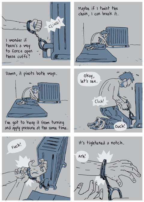 Je fascinující, kterak neustále zarůstající rukojmí, ač do jisté míry vystrašen, neztrácí duchapřítomnost. Neustále analyzuje svou situaci, přemýšlí a srdnatě se drží nad propastí šílenství. Každá změna či nečekaná malá událost jsou mu zdrojem úvah i určité "radosti". A čtenáři tuto kalvárii díky chytře vystavěnému komiksu prožívají s ním. Je to vlastně komorní a opakující se statické dění s menšími obměnami takřka výhradně mezi těmi jedněmi čtyřmi stěnami. Už zítra se něco stane, už zítra přijde vysvobození, říká si Christophe i čtenář a oba jsou mnohonásobně znovu a znovu zklamáni, když přijde rozbřesk nového dne. Unylost plynutí takového času a takové beznaděje je zachycena Delislovým výtvarným stylem, tmavým, téměř bezbarevným, a jednoduchou, lehce rozháranou kresbou, která připomíná skicák. Delisle chce vyprávět výhradně z perspektivy mysli svého hrdiny. "Věděl jsem, že musím napsat knihu, která čtenáře vtáhne do děje. Chtěl jsem, aby se čtenář s hrdinou skutečně dusil, aby s ním zůstal a ukázal, jak přežít v situaci, kdy nemáte nad svým životem žádnou kontrolu," popsal autor v jednom z rozhovorů. Zároveň se svěřil se svými sebekritickými postoji: "Po dokončení 300 stran byl Christophe stále v té místnosti a já si pomyslel, že to bude nuda. Měl jsem pochybnosti, tak jsem to dal přečíst přátelům, kterým věřím, protože jsou dobří čtenáři, a svému vydavateli, a čekal jsem na jejich reakci. Řekli mi, že je to dobré, a požádali mě o zbytek stránek..."