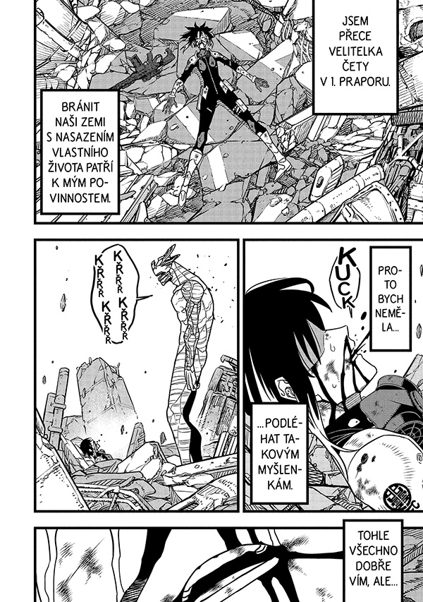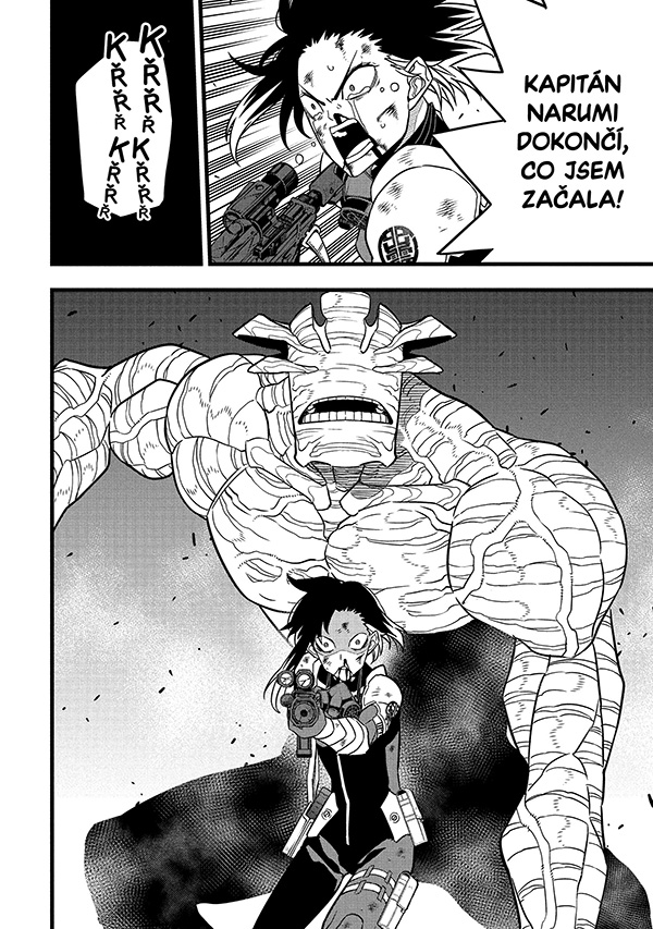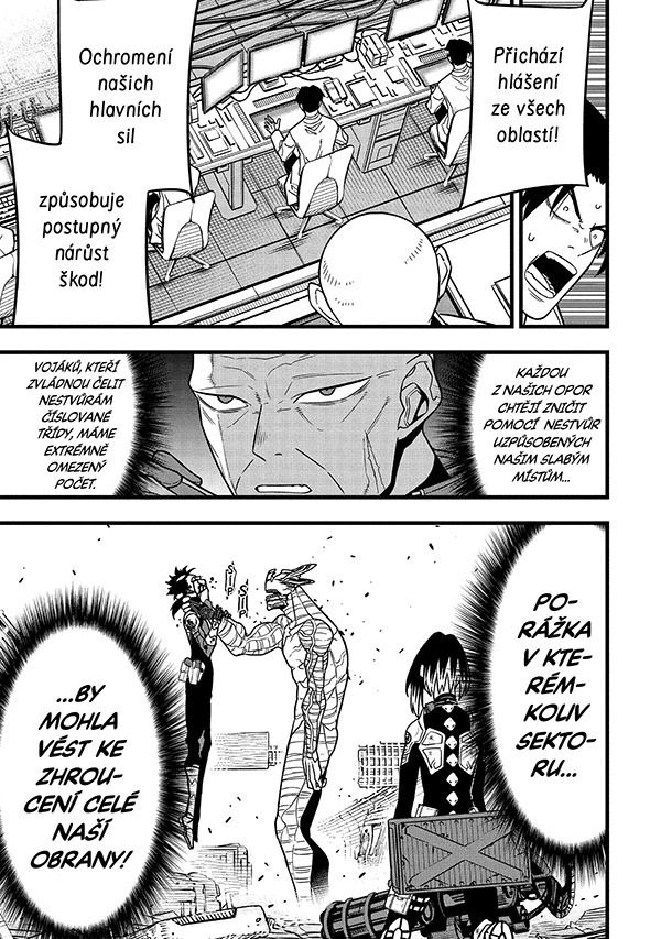 Pětice velestvůr stvořených Číslem 9 podnikla koordinovaný útok na pozice Východní divize rozptýlené po Tokiu a v jeho okolí. Každá z nich je přizpůsobena na míru jedné z klíčových opor Obranných sil, které jsou jedna po druhé zataženy do nerovného boje. Kafka mezitím vzpomíná na slib, který před bitvou dal Kikoru. Co to jen mohlo být?