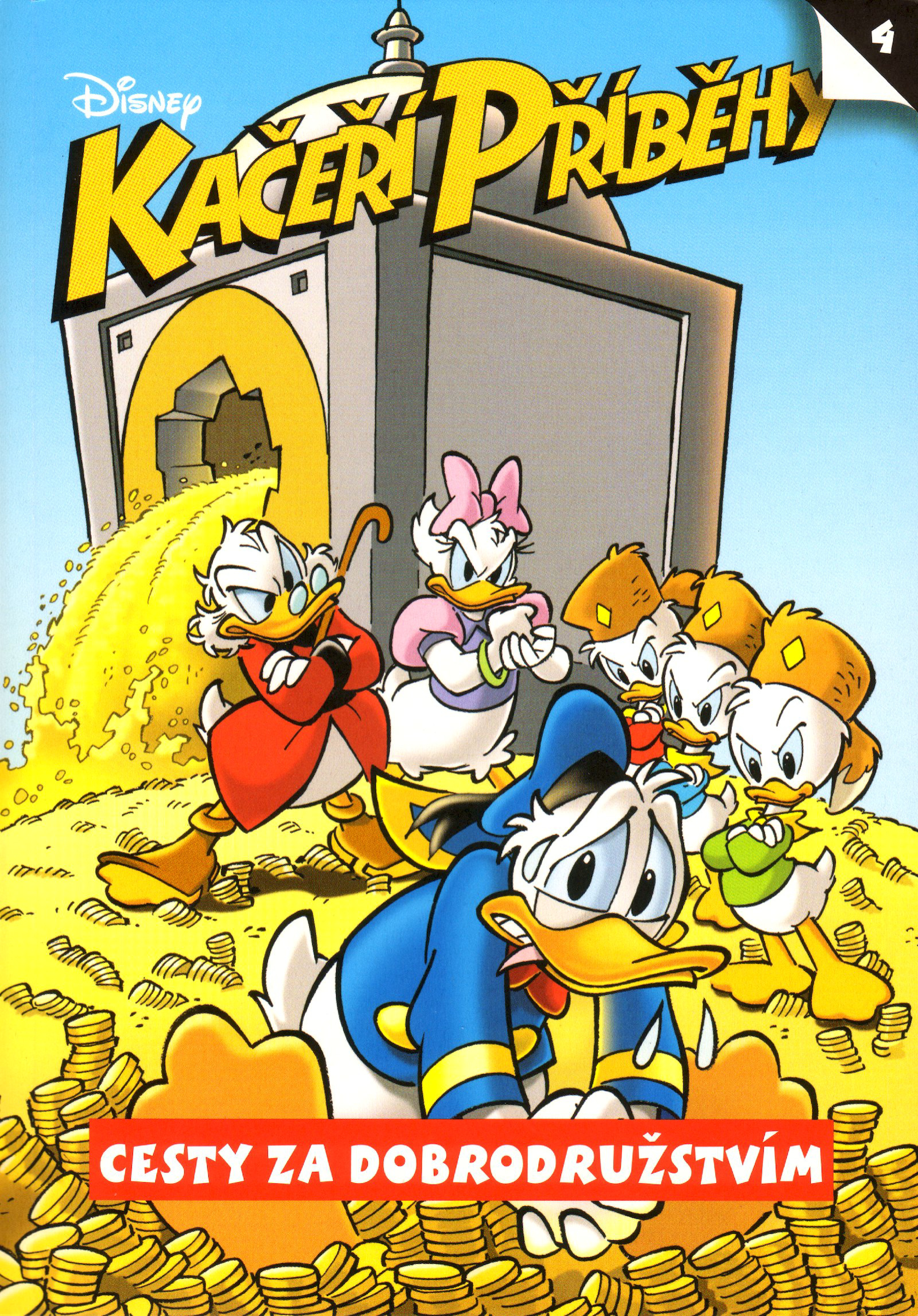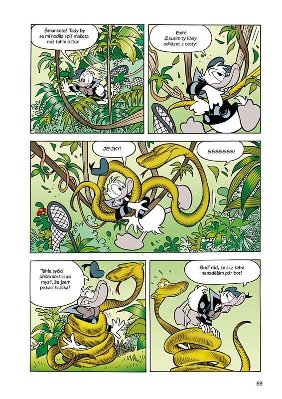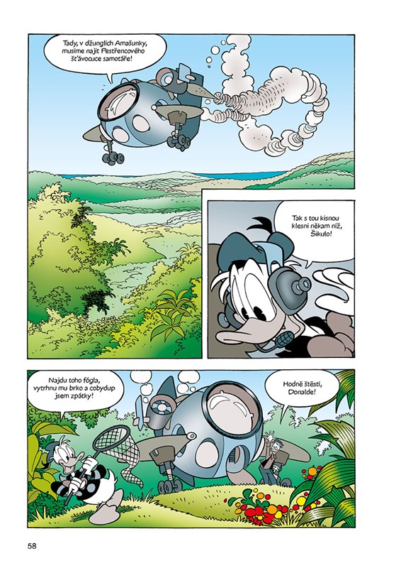 „Nechte si své komentáře! Každý má občas právo na maličkou chybu!“ Mám z toho veľmi pozitívne pocity. Dokonca zrejme najlepšie zo všetkých štyroch dielov. Spoločným menovateľom skoro všetkých piatich príbehov, ktoré tu sú obsiahnuté, sa stáva Donald. Výnimkou je iba posledný, kde opraty preberá húser (ehm, gunár) Gusto a jeho povestné šťastie. Ktoré ale dostáva nečakane osviežujúco na frak. Donald je tak trochu kretén. Ale sympatický kretén, pretože to v podstate vždy myslí zo srdca, len sa to skrátka vždy nejako pokazí. Scenáristi ho síce líčia ako úplného trpáka a neschopáka, ktorý sfušuje všetko, na čo siahne, čo však nejde dokopy s jeho pilotskými schopnosťami. Prvá polovica prvého príbehu je dynamicky nahláškovaná („Ach jo, dneska se mi moc nedaří!“; „Zmizím odsud, dokud je ještě v šoku.“). Trocha jej to kazí nudnejší dojazd, ktorý sa nesie v duchu orwellovských klišé. Aj v druhom príbehu je dôraz kladený na Donaldov závideniahodný talent na prúsery. Navyše vynaliezavo pracuje s farbami. V treťom je Donald nečakane, ale funkčne spárovaný s Mickeym (ak sa vám táto divoká kombinácia páči, odporúčam Hrůzopark – Děsuplné dobrodružství Mickey Mouse od CREW, kde sa ku nim ešte ako bonus pridal starý dobrý Goofy) a akoby toho nebolo málo, riešia veci spojené s láskou, čo je vcelku atypické (hoc nie je príliš jasné, o čo káčerovi a myši ide, či nebodaj nie o sex s inkriminovanou ľudskou slečnou, z čoho som bol pravdupovediac jemne znepokojený). A je to vyšperkovanými zlatými nápadmi (vystresovaný oddávajúci). Milý je i predposledný príbeh, s olympijskou tematikou. Viackrát som nadobudol pocit, že to nie je primárne určené malým deťom, ale čiastočne i dospelým, čo považujem za osviežujúce. Palec hore dávam za uvádzanie mien scenáristov a ilustrátorov na začiatku každého príbehu (hoc nechápem, aký je rozdiel medzi "príbehom" a "scenárom"). WTF dojem som mal zo šialeného množstva výkričníkov. Temer každá (!) veta sa končí nie bodkou, lež práve výkričníkom. Akoby bodka ani neexistovala (ak dáme bokom trojbodku, s ktorej používaním sa to tiež extrémne preháňa). Čítal som tisíce poviedok, noviel, románov a komiksov, ale s týmto som sa ešte nestretol.