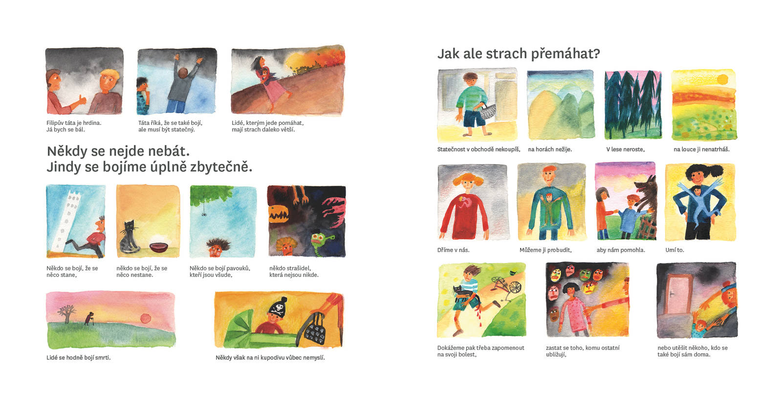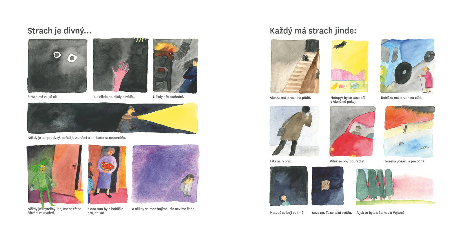 Ilustrovaná, typograficky zajímavě pojatá kniha o různých tvářích strachu a zacházení s ním. O strachu se nám většinou těžko mluví a děti na tom leckdy nejsou jinak. A pak se nám některé věci v životě také těžko konají. Kniha je určená malým dětem a těm, kdo si s nimi čtou a povídají. Kniha je koncipována jako několik etud, na začátku nabízí různé pohledy na to, jak a kde strach potkáváme, pak se do jednoho příběhu podívá a na konci se snaží zůstat otevřená našim vlastním příběhům - i po svém zavření.