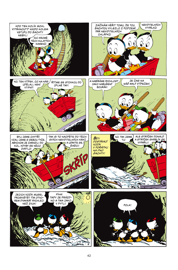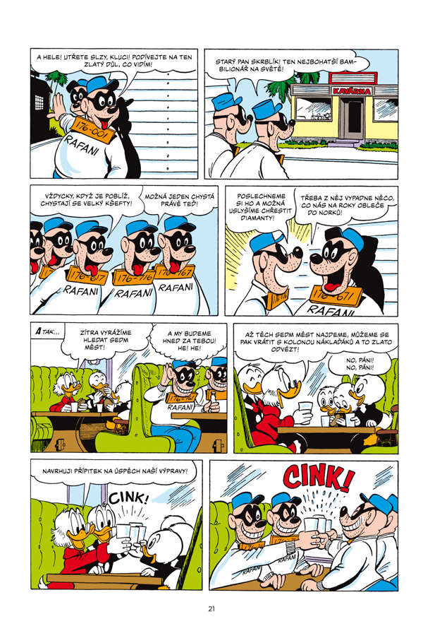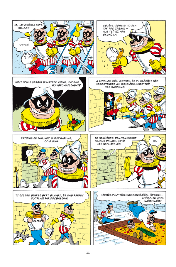„Nechte si to fňukání! Ruce máte, tak si najděte práci!“ – „Ach, jak krutý a bezcitný se k nám Rafanům ten svět zachoval!“ Klasika z 50. rokov, ktorá o pár rokov (desaťročí) neskôr inšpirovala Spielberga a Lucasa pri vymýšľaní Indiana Jonesa (útek pred obrovskou guľou z jednotky, naháňačka na banských vozíkoch z dvojky atď.). Zároveň je to môj druhý disneyovský komiks od CREW (po Myšákovi Mickeym: Hrůzoparku). Som rád, že môžem i po druhý raz skonštatovať, že je to naozaj nebe a dudy. Nirktorí iní českí vydavatelia si svoje rodinné disneyovské zlato nevážili. Vydania boli nejeden raz odfláknuté (preklad, papier, rôzne chyby, asi všetci fanúšikovia vieme o čom je reč a už to netreba rozpitvávať). CREW na to našťastie podľa očakávaní ide úplne inak. Kým Myšák Mickey: Hrůzopark bonusy nemal, zato ich absenciu kompenzoval parádnym vzhľadom (veľké rozmery, krásny fialovo-zlatý chrbát, kvalitný papier, tvrdá väzba), tentokrát CREW síce siahla po paperbacku a zmenšila rozmery, zato pridala bonusy. Čiže aj tentokrát sa koná spokojnosť. Samotné príbehy? Sú tri (najmenej ma bavil prostredný s Koulenmi, prvý a druhý boli super, ale aj druhý bol fajn) a spoločné majú práve dobrodružstvo, prehľadávania nejeden raz podzemných a iných exotických priestorov spravidla za účelom finančného obohatenia sa. Najlepšie veci na svete sú spravidla najjednoduchšie a myslím, že komiksové disneyovky dlhodobo fungujú proste „len“ preto, že bambilionár Strýko Držgroš, Donald a Hui, Dui, Lui sú skvelá parta, medzi ktorou to iskrí, každý je iný, ale keď treba, držia pri sebe a navzájom sa dopĺňajú. Samozrejme nie každý disneyovský komiks je báječný. Ale tento je, veď ho robil jeden z najznámejších disneyovských tvorcov Barks (narodil sa v rovnakom roku, ako Walt Disney, nehovorte mi, že je to náhoda). Hravý preklad samozrejme vždy poteší, to v CREW veľmi dobre vedia („Pět miliard kvantilionů bžundylionů pikilionů bambiliard fantastyliard dolarů.“).